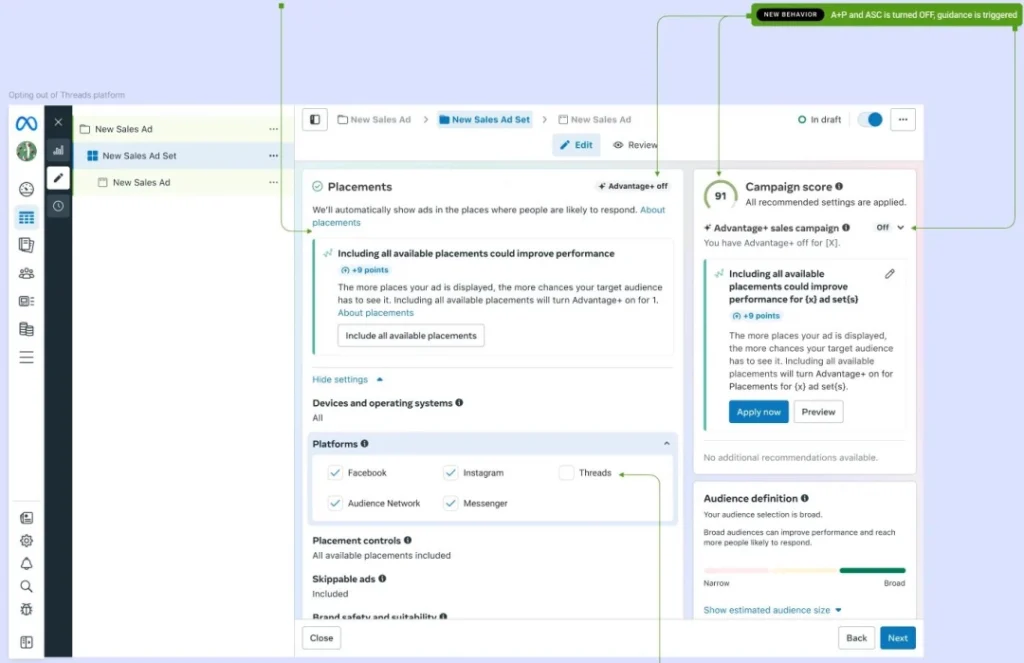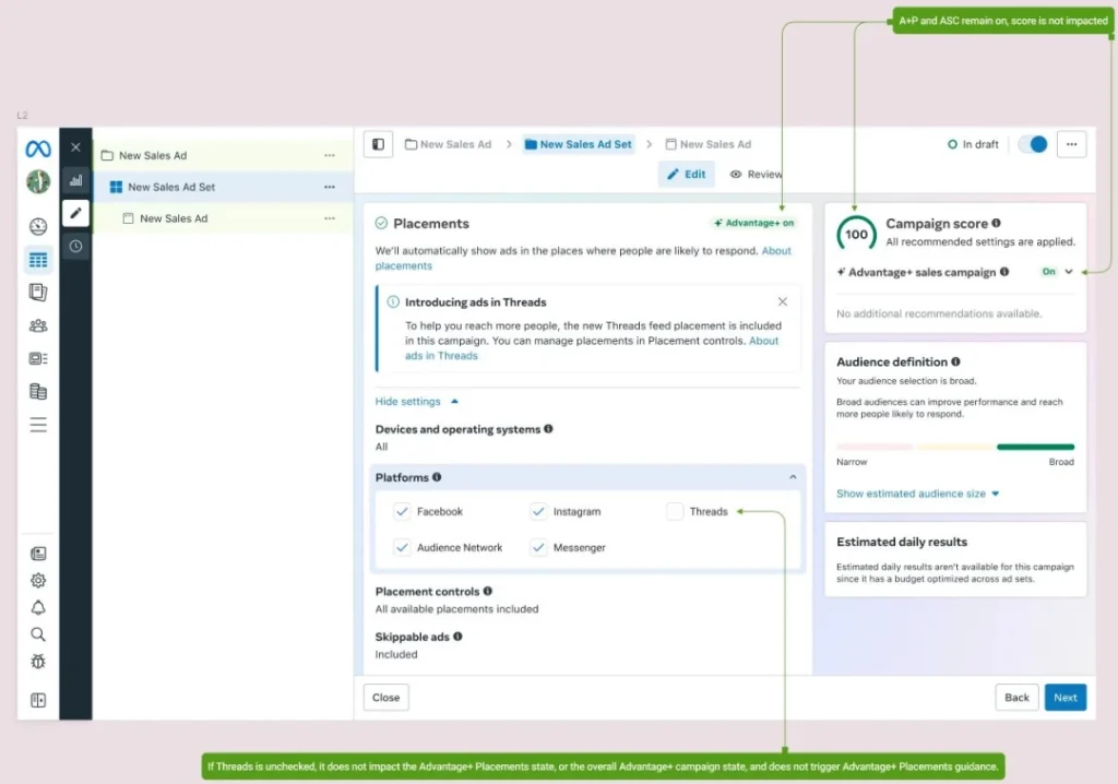 2025年12月2日起,Threads动态版位的选择将在广告组层级影响进阶赋能型版位的启用状态,进而在广告系列层级影响进阶赋能型功能的启用状态。
